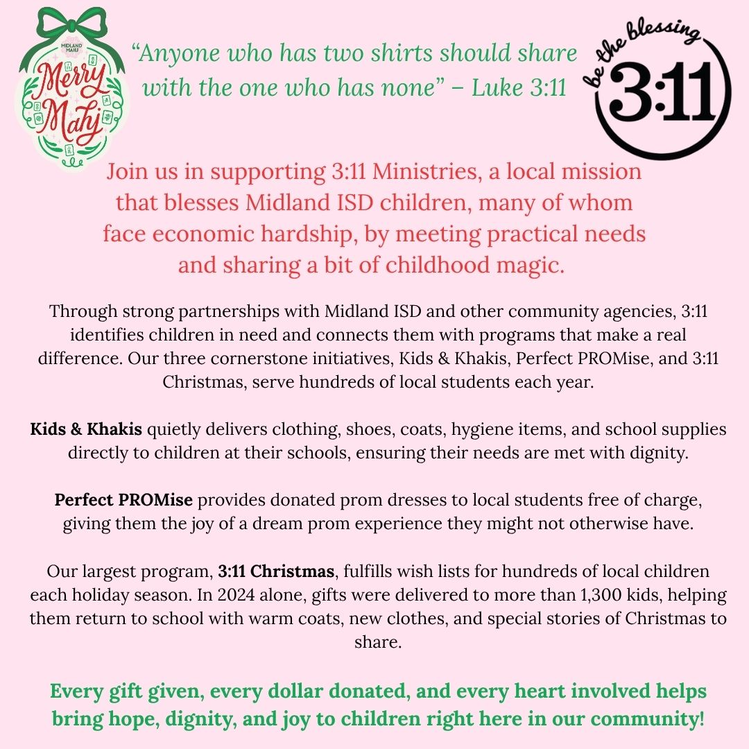 Deck the halls and shuffle the tiles join us for Merry Mahj on December 3rd from 5:30-9pm! Join us in supporting 3:11 Ministries, a local mission that blesses Midland ISD children, many of whom face economic hardship, by meeting practical needs and sharing a bit of childhood magic!